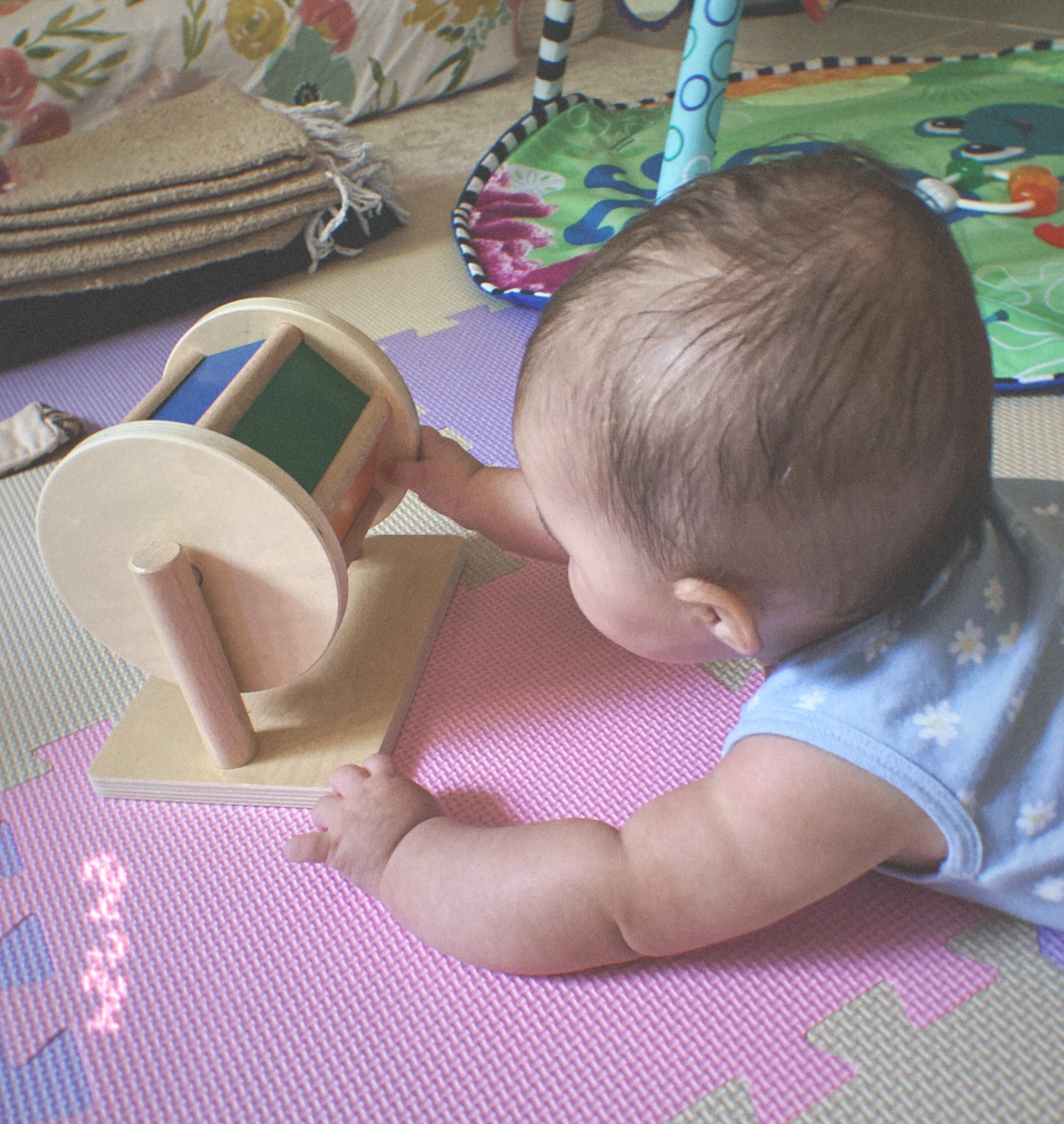 My daughter enjoying tummy time with the spinning drum